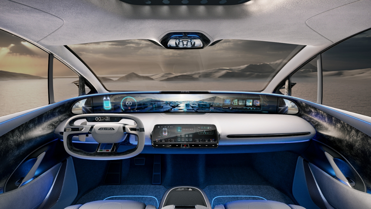 Oltre al display gigante, spicca il volante a forma di giogo dalla forma oblunga, con il logo Aehra e bandiera italiana che ricorda che l’azienda è l’unica nel Bel Paese a produrre esclusivamente veicoli elettrici. Il design è un omaggio a Hazim Nada, CEO e co-fondatore di Aehra, appassionato di aeroinautica, e a Sandro Andreotti, COO e altro fondatore del marchio, pilota e paracadutista. Entrambi sono anche i fondatori di Aero Gravity a Milano, la più grande galleria del vento verticale coperta in Europa.
