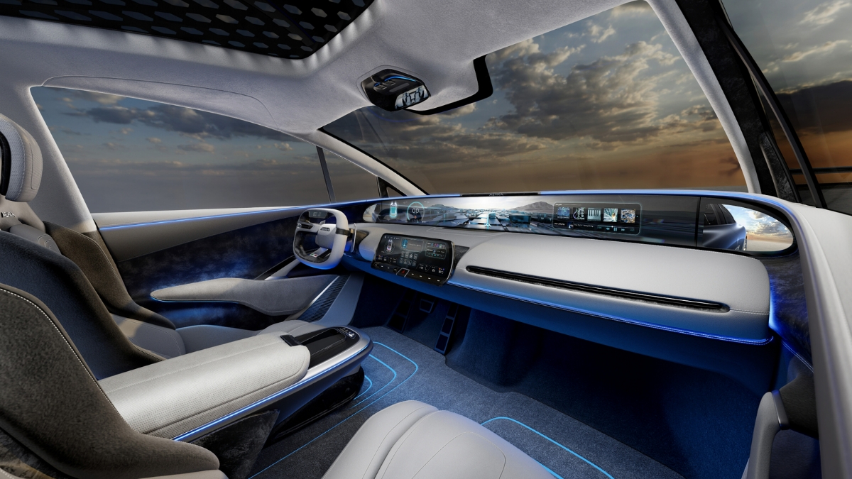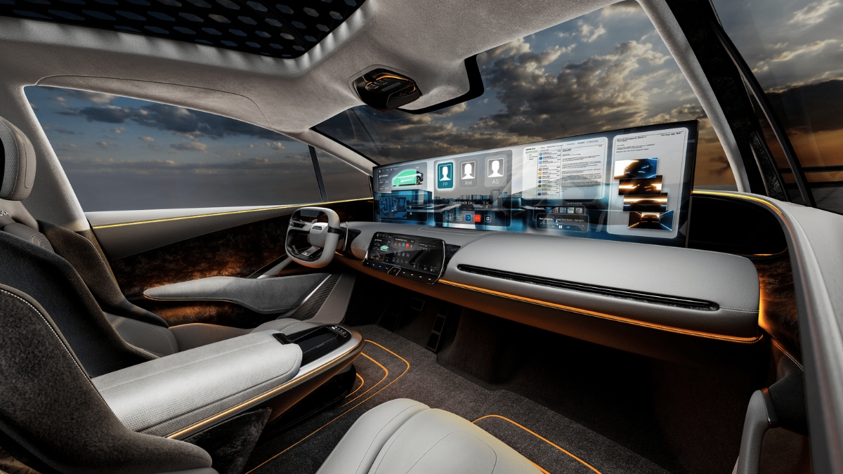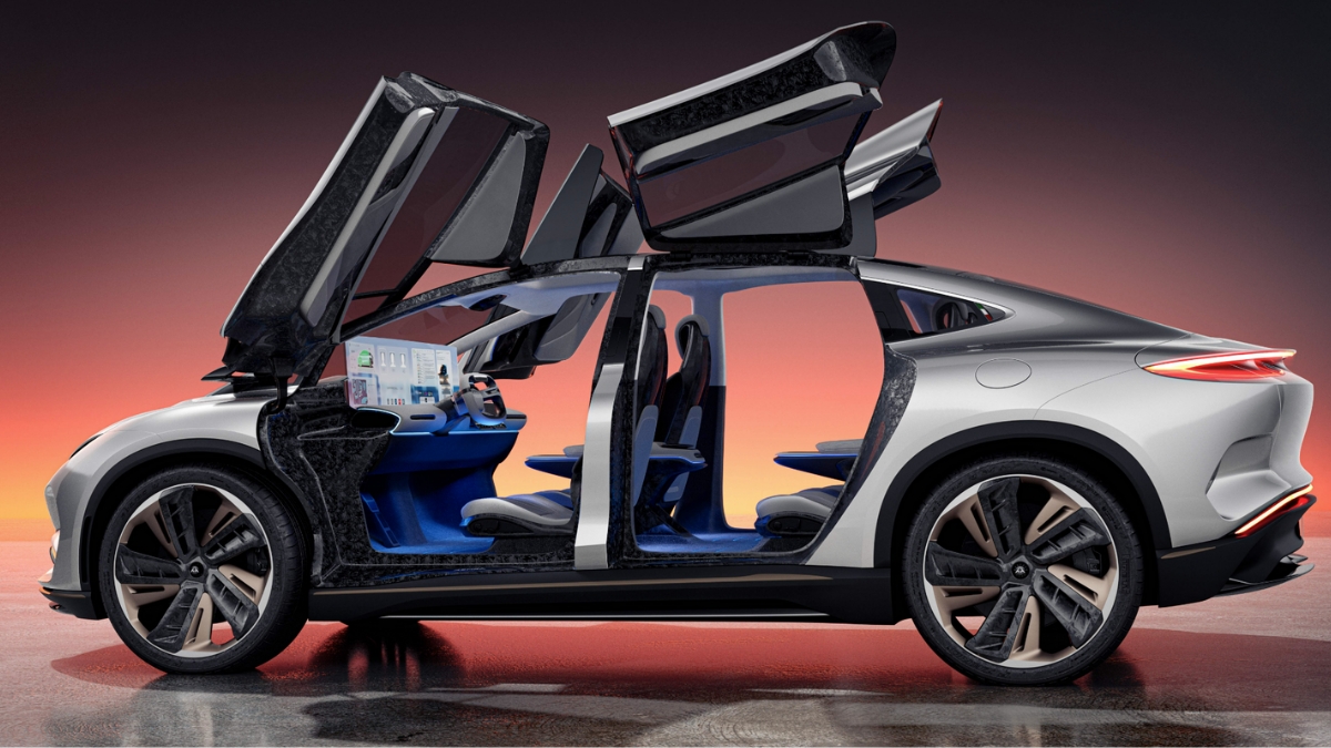 Gli elementi esterni, pur già moderni e scenografici come le telecamere che fungono da retrovisori esterni poste per enfatizzare il flusso aerodinamico, o l’apertura ad ali di gabbiano di tutte le portiere, non sono però nulla in confronto a una scelta di interior design mai vista su un’auto destinata alla produzione in serie.