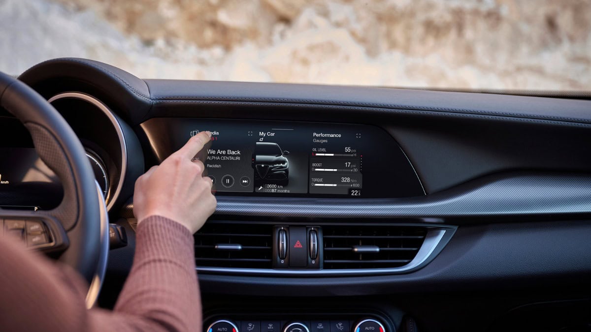 Al centro, fortunatamente, il display touch da 8,8 pollici rimane integrato nella plancia, con OS aggiornato che supporta aggiornamenti Over-The-Air e connettività da remoto. Si integra infatti con gli Alfa Connected Services, per controllare l’auto a distanza via smartphone.