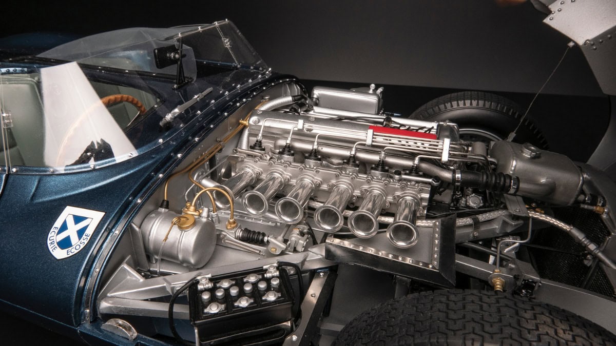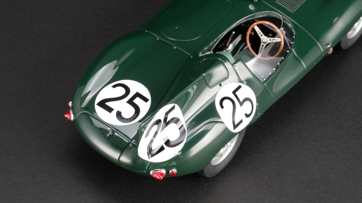 Ci sono volute 4000 ore di lavoro per sviluppre il modello in scala 1:18, con uno sviluppo che ha visto lavorare sui dati CAD ottenuti in seguito alla scansione del telaio originale della D-Type, nello specifico la XKD 505/601. Così, gli ingegneri hanno fabbricato un modellino per ogni componente dell’auto, e sono in seguito stati stampati in 3D per essere rifiniti a mano.