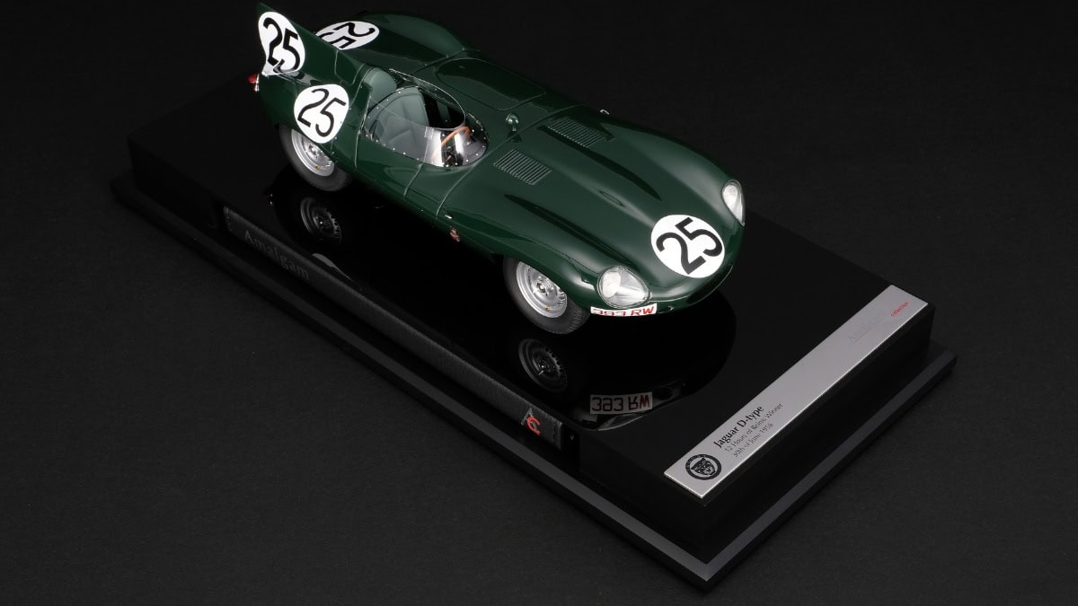Realizzata sempre con cura artigianale, questa volta è in scala 1:18 con una lunghezza massima di 22 cm, con un prezzo di 1.105 €. RIproduce la XKD 605 che vinse il 30 Giugno 1956 alla 12 Ore di Reims grazie ai piloti Duncan Hamilton e Ivor Bueb. Tutti i modelli sono rifiniti nel verde Jaguar British Racing, e sono realizzati nei laboratori di Amalgam Collection utilizzando dati CAD e in seguito alla scansione di un vero telaio D-Type.