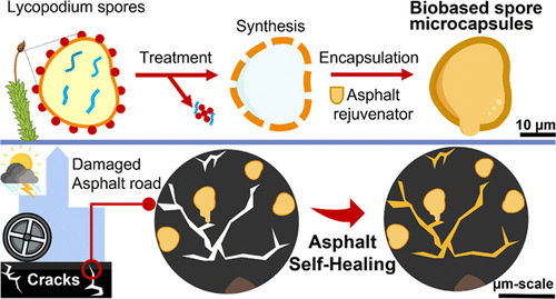 I ricercatori hanno quindi ideato un sistema per rigenerare il bitume prima che le crepe diventino irreparabili. Hanno prelevato spore dal muschio Lycopodium clavatum, trattandole chimicamente per svuotarle del loro contenuto. Queste strutture cave sono state poi riempite con olio di girasole, noto per le sue proprietà rigenerative.