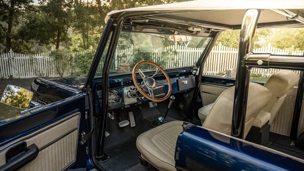 Il tetto bikini ha colori invertiti per risaltare nel design: all’esterno, riprende il color crema degli interni; dentro, invece, richiama il blu della carrozzeria. Internamente c’è poi il volante con rivestimento in legno, una leva cromata per il cambio automatico a tre rapporti, il sistema audio Kenwood e l’avvio a pulsante. Non ci sono, invece, finestrini laterali, che sono stati rimossi.