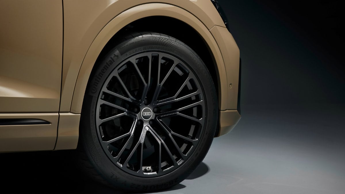 La Audi SQ8 esce di serie con cerchi da 21 pollici e pneumatici da 285/45. In alternativa, Audi Sport propone altri cerchi da 21 e 22 pollici. La gamma più grande disponibile è costituita da cerchi da 23 pollici con pneumatici da 285/35. Per una maggiore varietà, Audi offre altri nuovi cerchi in lega da 23 pollici per la SQ8 TFSI appositamente progettati per l’aspetto sportivo dell’auto. I dischi dei freni sull’asse anteriore hanno un diametro di 400 millimetri; sull’asse posteriore misurano 350 millimetri. Le pinze dei freni nere, disponibili opzionalmente in rosso, portano il logo S che definisce l’aspetto di Audi sull’asse anteriore.