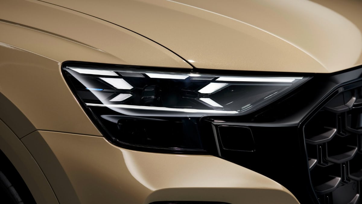 Novità per quanto riguarda il design e la tecnologia dei gruppi ottici I fari LED ad alta intensità illuminano la strada sulla Q8 standard, che ha come optional i fari LED Matrix. Sono disponibili anche i fari HD Matrix LED con luce laser Audi, riconoscibili immediatamente grazie a una luce blu incorporata. La luce laser diventa attiva a partire da 70 km/h e aumenta significativamente la portata dell’abbagliante.