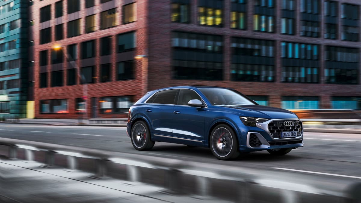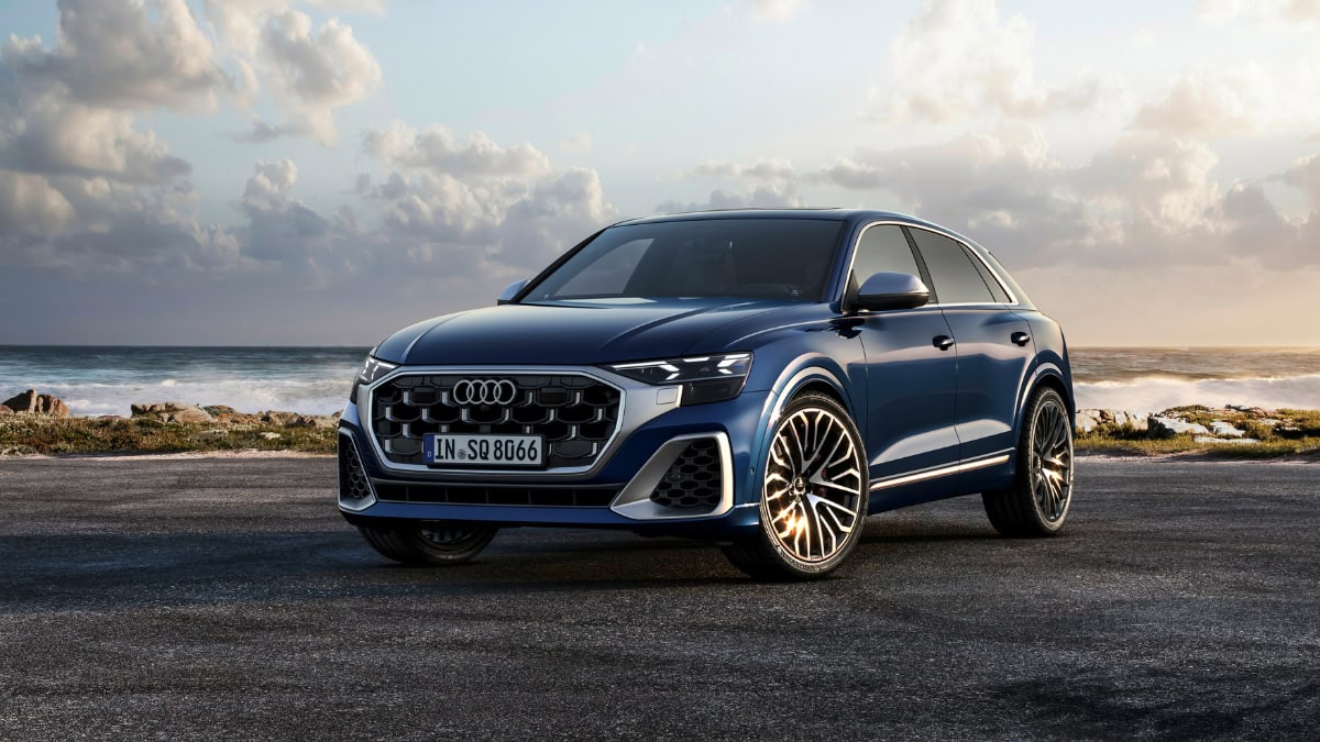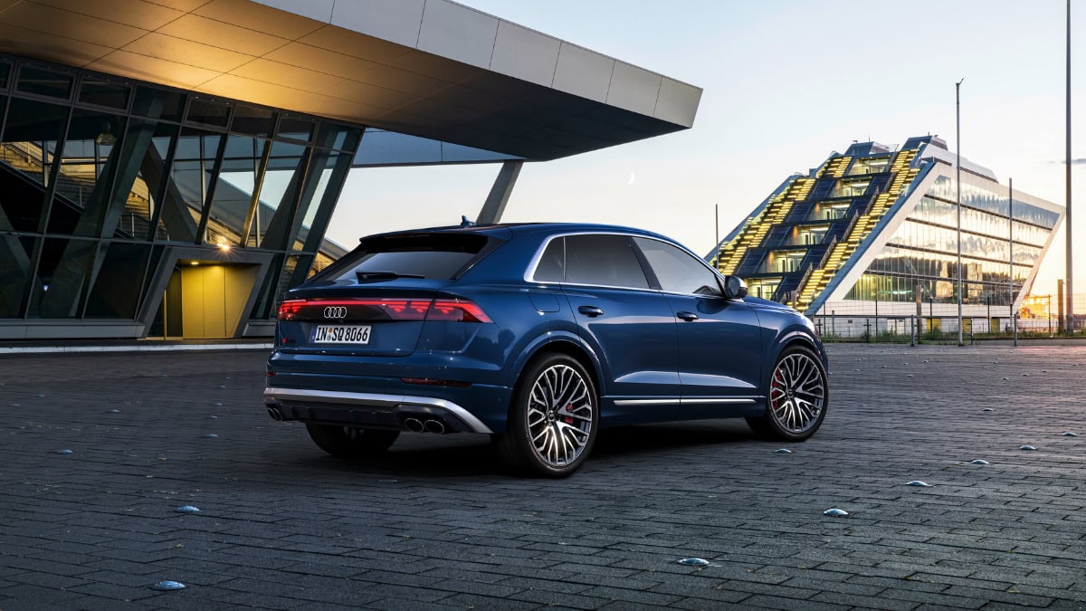 Al top della gamma, nuova Audi SQ8 si distingue con uno spoiler ridisegnato sul paraurti anteriore, un’aspetto sportivo dell’elemento di protezione sottoscocca anteriore e un diffusore espressivo sul retro. La griglia single-frame si distingue con inserti verticali a forma di L in una colorazione sportiva. Le prese d’aria più grandi presentano griglie a nido d’ape sulla loro superficie.