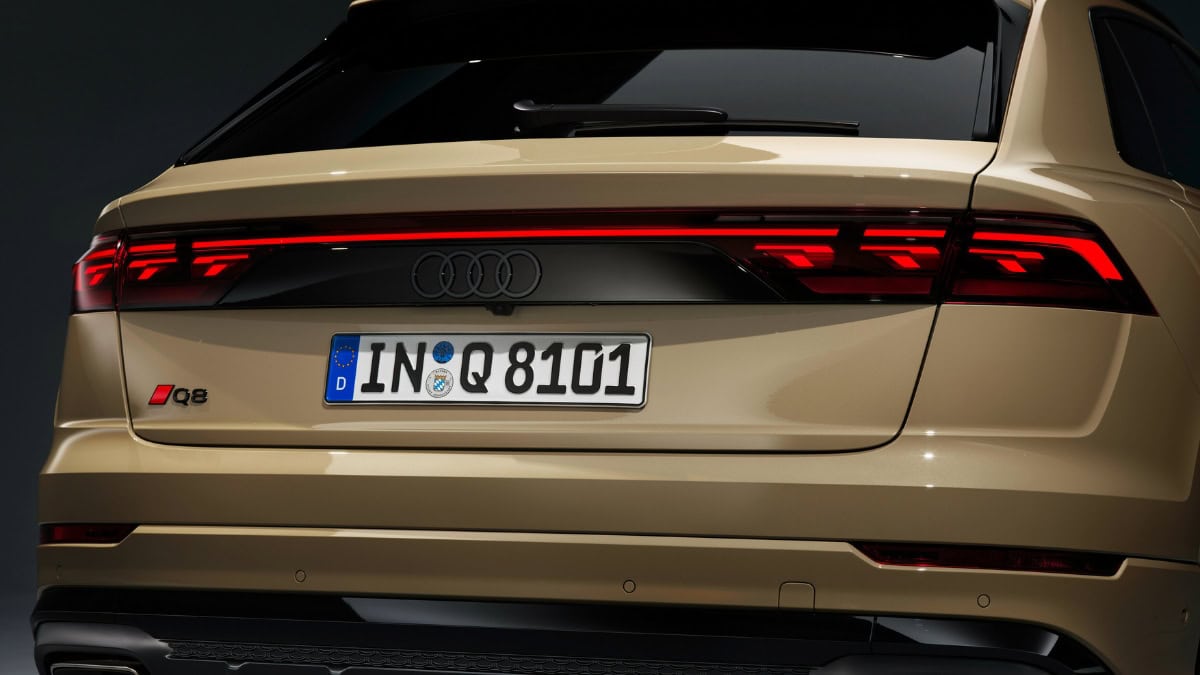 Come l’Audi A8 e Q5, i fanali posteriori digitali OLED nella Q8 incorporano una funzione di indicazione di prossimità che funziona in tandem con i sistemi di assistenza. Quando i veicoli che seguono si avvicinano a meno di due metri dalla Q8 ferma, le centraline attivano l’accensione di tutti i segmenti digitali OLED. Le funzioni aggiuntive includono frecce dinamiche e varie sequenze di “coming home” e “leaving home“.