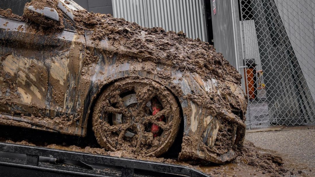 Come si vede dalle immagini, la RS3 è completamente ricoperta di fango, con ingenti danni soprattutto nella parte anteriore che si è trovata maggiormente coinvolta nell’impatto e che è fondamentalmente da rifare.