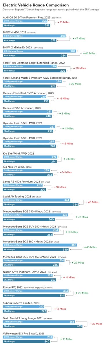 Alcune auto, come la Mercedes-Benz EQE sedan hanno invece superato le stime EPA, aggiungendo 72 miglia (116 km) all’autonomia prevista. I modelli EV di BMW, come la i4 e la iX, hanno anche superato le aspettative, aumentando l’autonomia rispettivamente di 47 miglia (75 km) e 46 miglia (74 km) così come Rivian R1T, 20 miglia (32 km) , Volkswagen ID.4 13 miglia (20,8 km), Hyundai Ioniq 5 11 miglia (17,6 km), Genesis GV60 e Kia EV6 con un aumento di tre miglia (4,8 km).