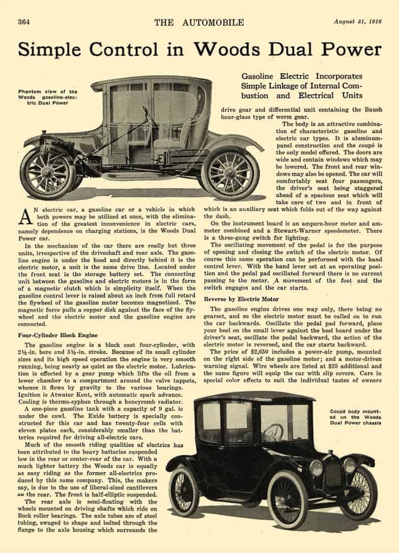 In mezzo alla crescita delle automobili a benzina, un ingegnere di nome Clinton Edgar Woods seguì una strada alternativa. Invece di scegliere tra elettrico e benzina, combinò entrambi i sistemi, creando uno dei primi modelli ibridi commercializzabili. Woods era già attivo nell’ambito delle auto elettriche dai primi anni del 1900 e nel 1916 presentò la sua vettura denominata Dual Power.