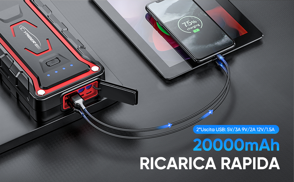 Grazie al robusto involucro e al suo design compatto, questo avviatore d’emergenza per auto è waterproof, antishock e antipolvere. L’avviatore di emergenza auto può avviare veicoli a 12V in pochi secondi con una corrente di 2.500 A e una batteria con capacità di 20.000 mAh.
