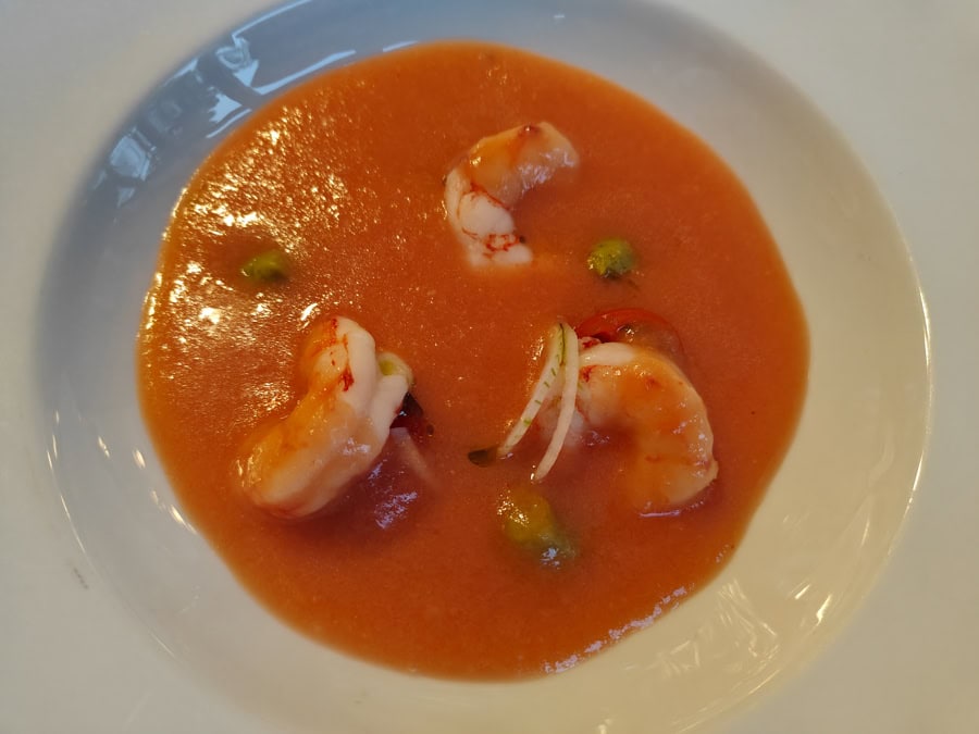 E finalmente, cibo! Si parte con Gazpacho, gamberi e crema di Avocado
