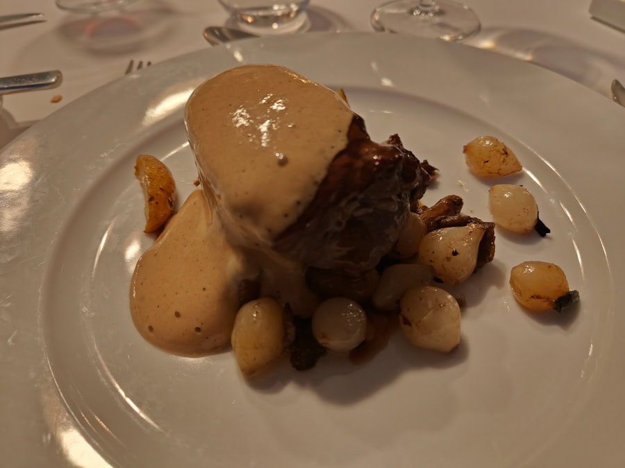 A seguire bistecca di vitello con crema di funghi e patate