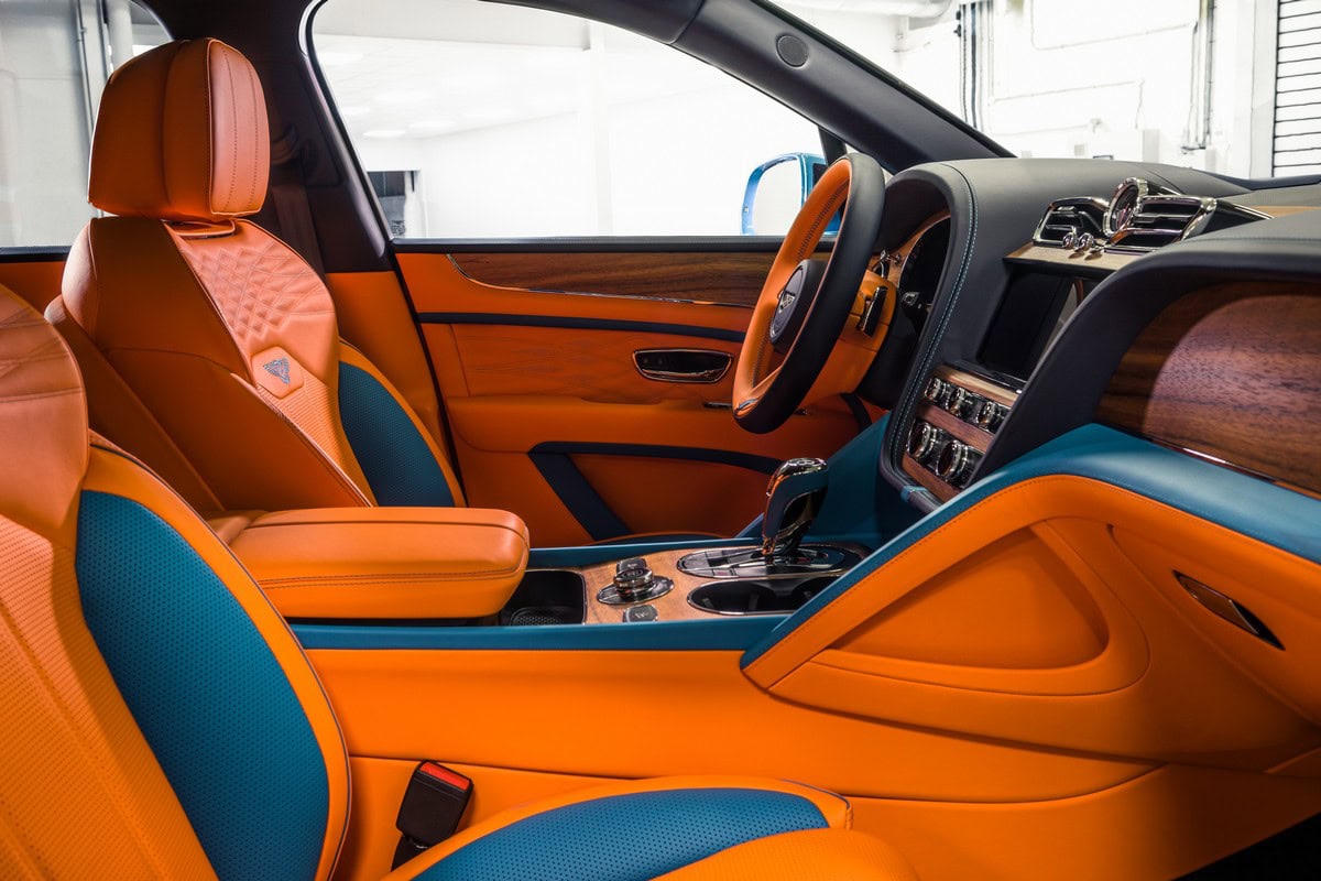 Gli interni di questa Bentayga EWB unica sono tanto straordinari quanto meticolosamente realizzati. Con una configurazione a quattro posti, l’impianto audio Naim e l’illuminazione d’atmosfera. L’abitacolo è in una spettacolare combinazione di pelle mandarino e blu imperiale. L’impiallacciatura di Koa a poro aperto, leggera, contemporanea e sostenibile è stata scelta per la fascia, la console centrale posteriore e gli interni delle portiere. Ma sono i lampi di pelle Kingfisher ad avere l’impatto più drammatico, apparendo sui cuscini dei sedili, sulla fascia inferiore, sulla linguetta delle sei sul volante, sulla leva del cambio e sui rivestimenti delle portiere.