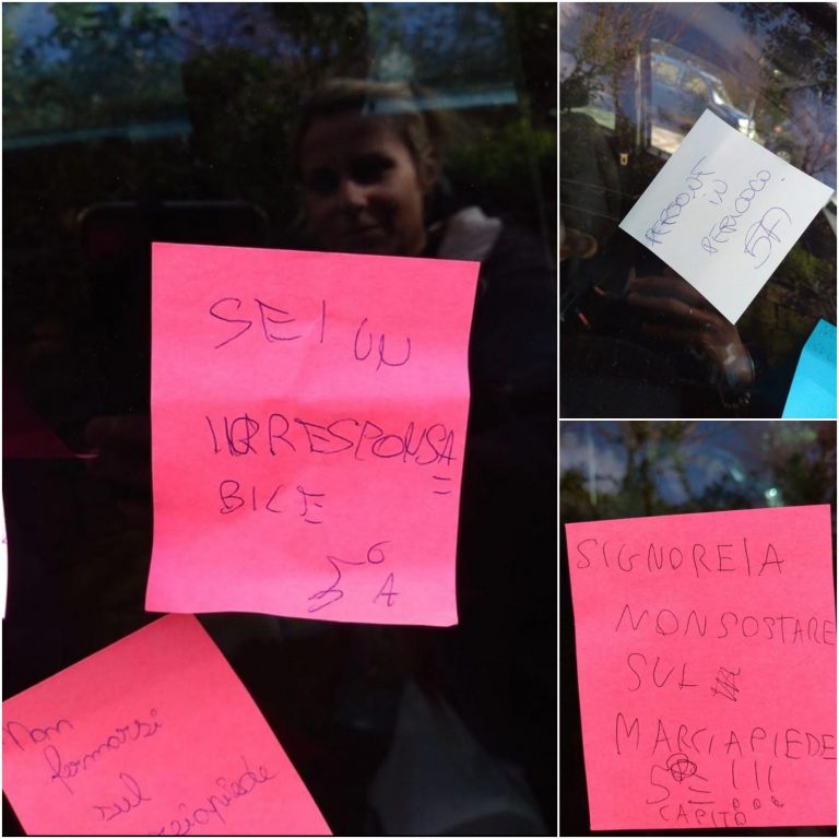 Piccole frasi e pensierini scritti su post- it colorati, messi sui parabrezza di tutte le auto in sosta su marciapiedi, in doppia fila e in prossimità delle rampe per gli invalidi.