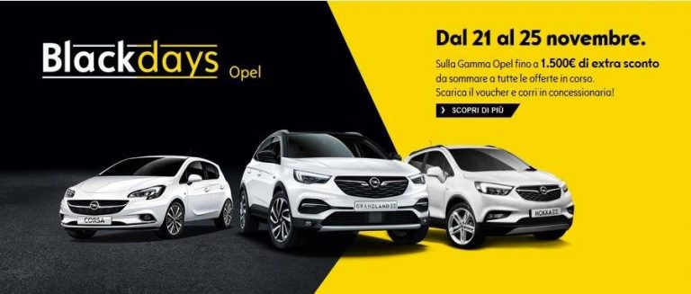 Il Black Friday Opel assume il nome di Operazione Black Days Opel. In questo periodo e solo per pochi giorni sarà possibile acquistare una nuova Opel, a condizioni economiche estremamente vantaggiose. Da tenere presente comunque tutte le promo auto di Novembre.