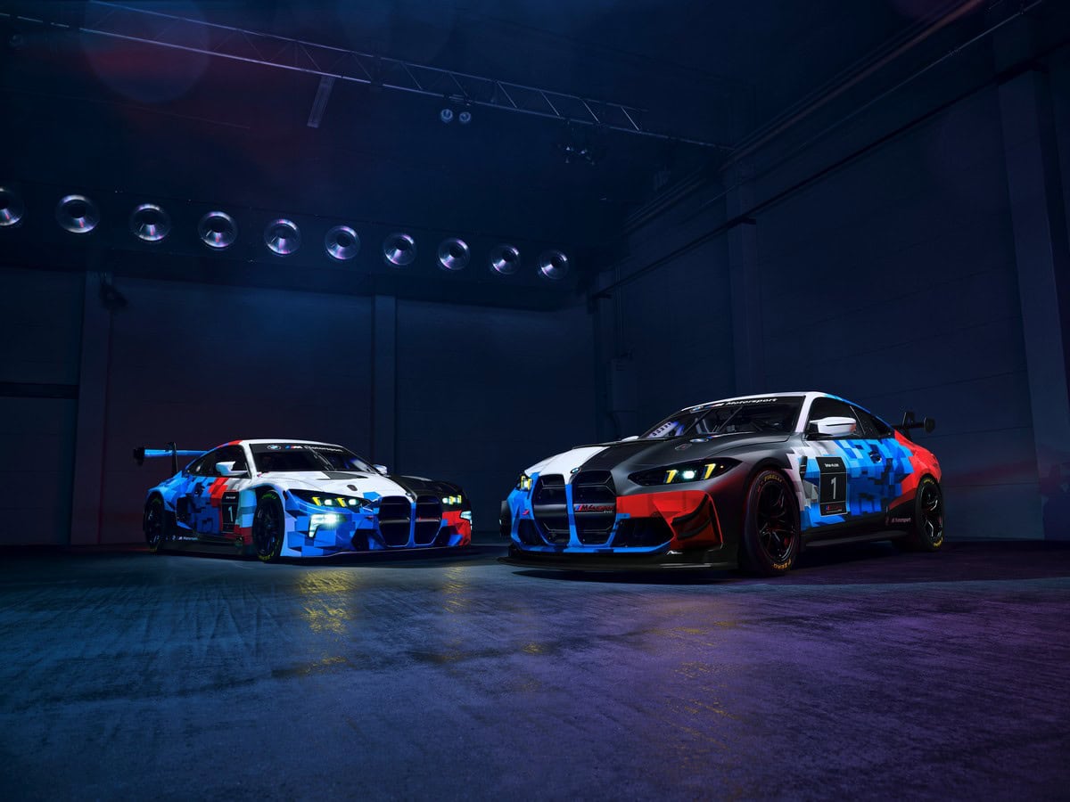 Il design “Inception” combina temi di digitalità e dimensionalità in un mosaico audace e ad alto contrasto. Da diverse angolazioni, i colori iconici della M appaiono nella sequenza del logo M: blu chiaro a sinistra, blu scuro al centro e rosso a destra, ma ora in tre dimensioni estruse, simili a pixel. Questo approccio crea un layout complessivo asimmetrico per la vettura, che include anche una porzione nera opaca non riflettente davanti al guidatore per migliorare la concentrazione. Per la BMW M4 GT3 EVO, nelle aree scure della livrea la pellicola è stata omessa, rivelando la struttura autentica in fibra di carbonio e risparmiando peso.