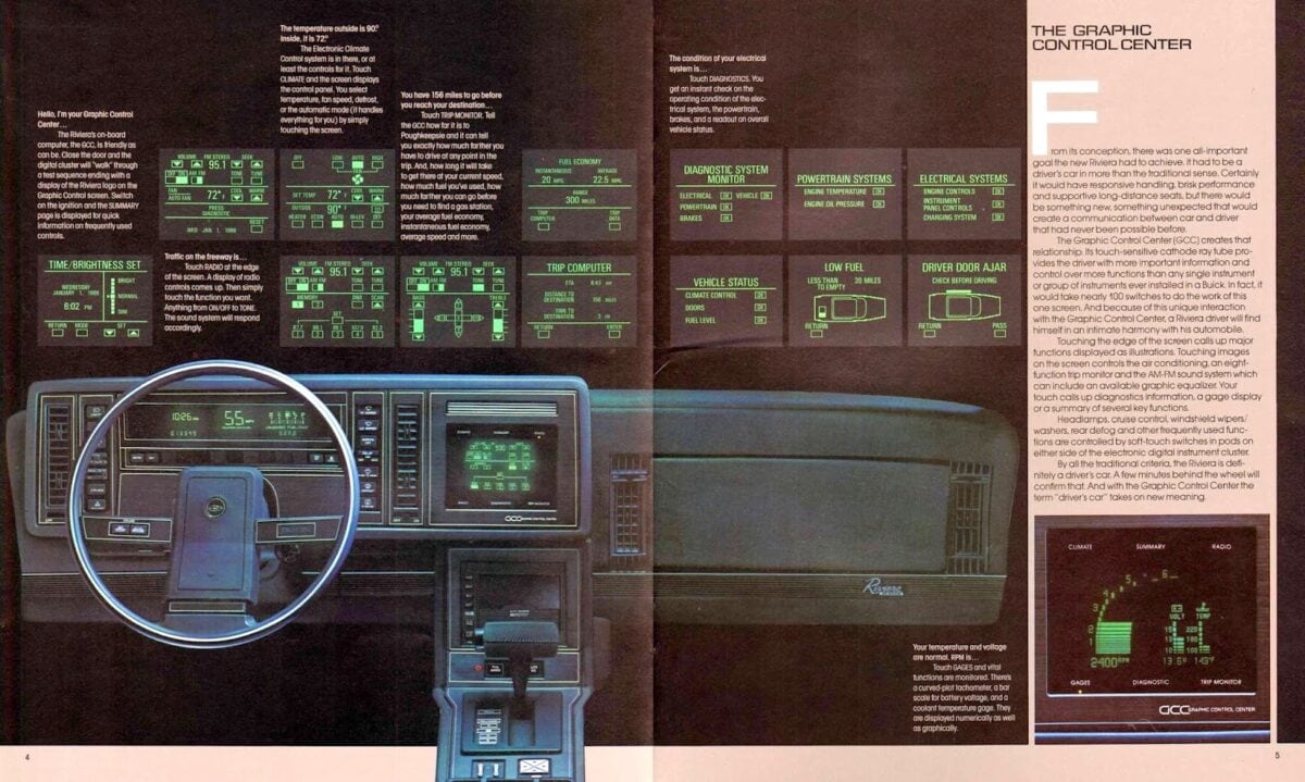 E fu proprio una Buick Riviera la prima auto sulla quale venne installato il primo sistema touchscreen a bordo. Un vero e proprio computer che si poteva utilizzare senza necessità di tasti o pulsanti. Cose da film, come si diceva all’epoca.