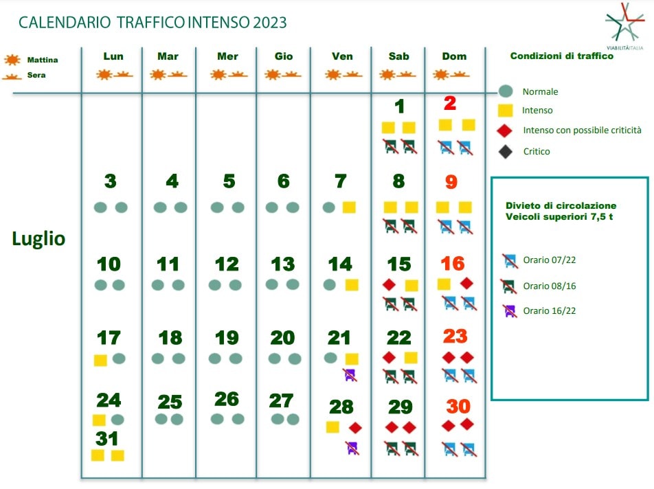 In vista degli spostamenti verso le località turistiche, anche di transito da e verso altri Paesi, ove trascorrere le vacanze estive, Viabilità Italia ha predisposto il calendario contenente le previsioni di traffico ed i divieti di circolazione per i mezzi superiori alle 7,5 t relativo al mese di luglio.