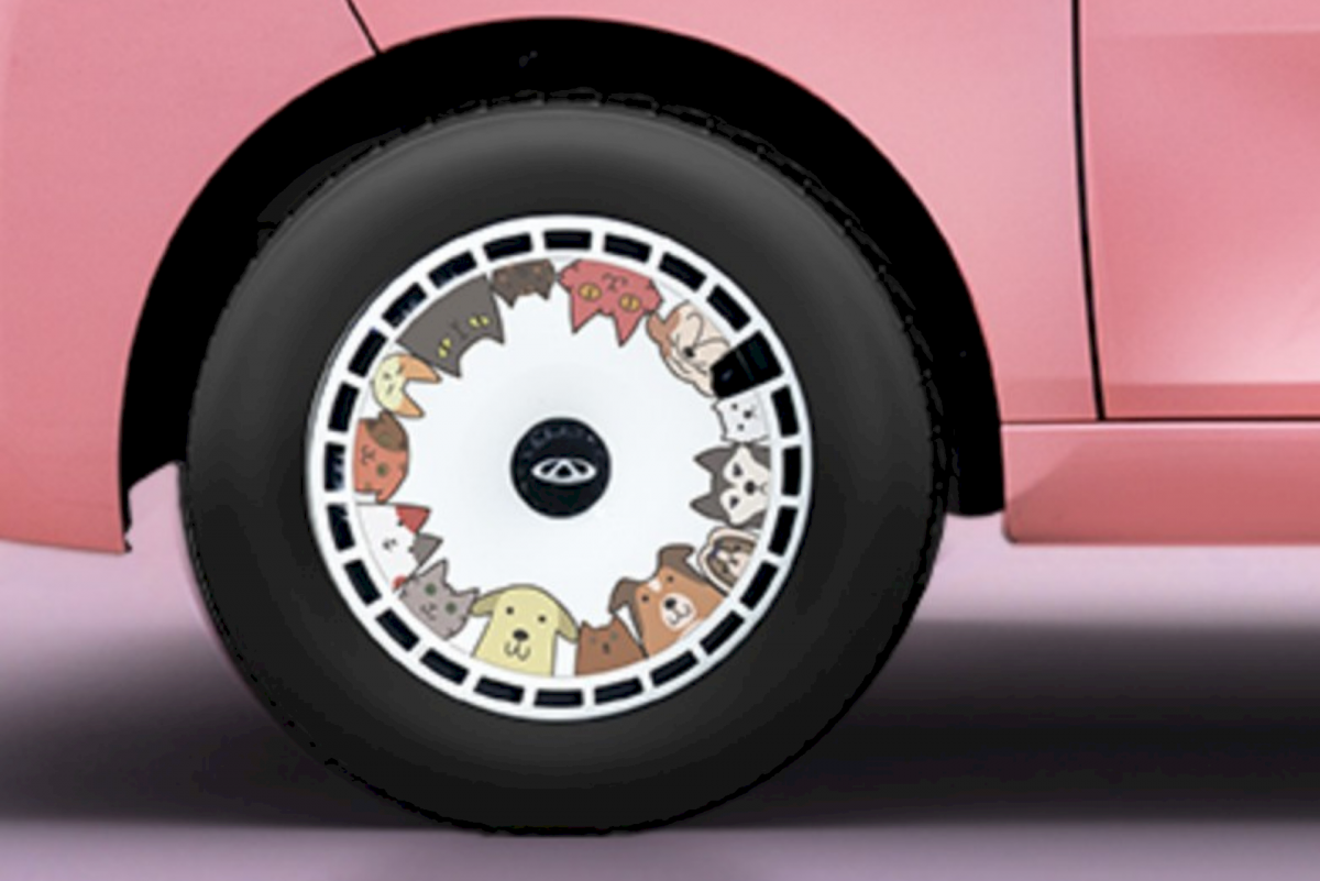 Il dettaglio forse più sconvolgente è quello legato ai cerchi, che sono “artistici”. Nel senso che Chery ha pensaot bene di adornare l’intera cornice di animaletti kawaii con tanto di sorrisi felici su sfondo bianco, mentre al centro campeggia il logo Chery su sfondo nero.