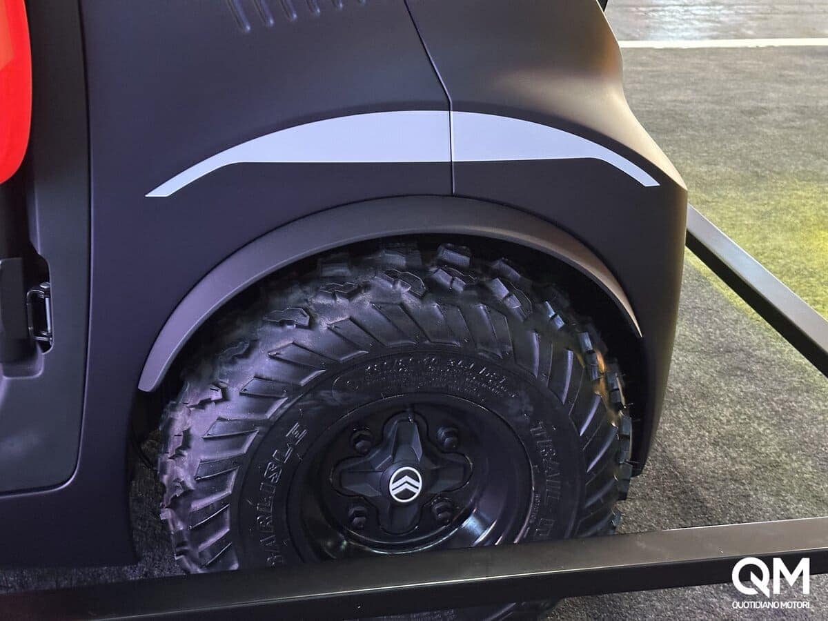 Le striature sui parafanghi e i finestrini a ribalta ricordano la storica Citroën 2 CV, un legame forte con la tradizione che però si inserisce in un contesto futuristico, grazie anche ai fari tondi gialli e alla barra a LED posta sopra il parabrezza.