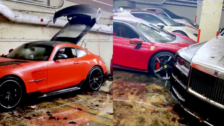 Nel video si vedono due Rolls-Royce Cullyan, una Corvette Z06, una Ferrari 488 Pista Spider, una SF90 e una Mercedes-AMG GT Black Series, tutte danneggiate dall’allagamento di un parcheggio sotterraneo a Miami.