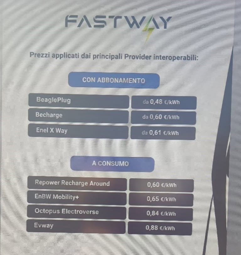 Le colonnine di Fastway sono le prime e al momento le uniche che indicano anche i prezzi dell’elettricità per la ricarica elettrica