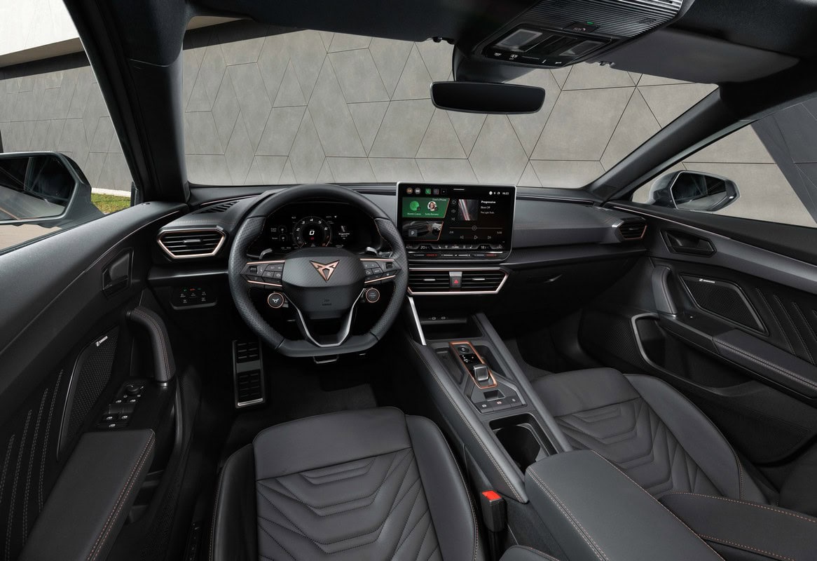 La nuova Formentor integra un sistema di infotainment con schermo da 12,9 pollici, che combina input touchscreen con una barra di scorrimento retroilluminata. Il sistema è compatibile con Apple CarPlay e Android Auto, e offre funzionalità di ricarica rapida wireless fino a 15 W. L’App My Cupra consente di controllare da remoto funzioni come la climatizzazione e la ricarica della batteria.