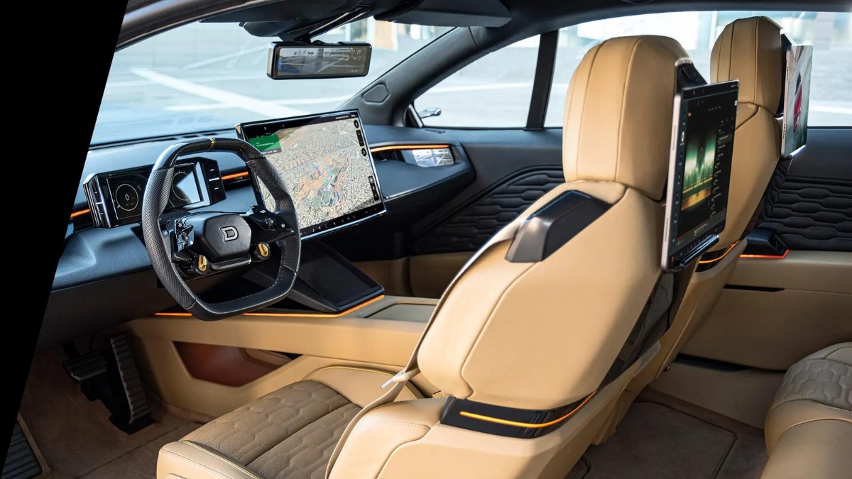 Interessanti i piccoli fari anteriori con texture diagonale, le prese d’aria laterali, i cerchi con pinze gialle, e il form factor coupé, mentre dietro il design è più sobrio, con fari larghi e sottili sempre a texture diagonale. Drako Dragon ha enormi porte ad ala di gabbiano, così larghe che non serve spostare i sedili anteriori per andare dietro, e questo nonostante le porte laterali siano solo due.