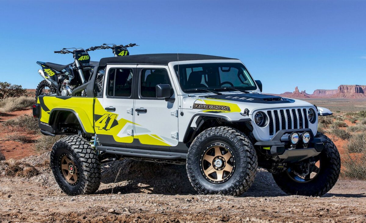 Jeep Flatbill è un concept completamente progettato per il motocross, e presenta sul cassone una coppia di moto infangate pronte all’azione. Dopo aver rimosso la sponda posteriore, sono state aggiunte rampe dedicate estraibili per facilitare l’accesso al cassone e le operazioni di carico. Interventi di personalizzazione hanno coinvolto la parte inferiore del cassone e il paraurti posteriore tubolare, che non solo serve da protezione ma incrementa l’angolo di uscita per offrire prestazioni estreme in fuoristrada.