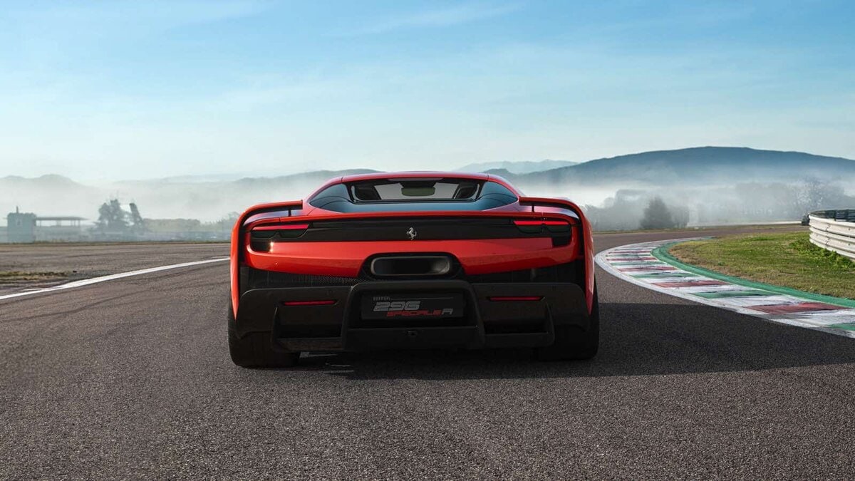 Il design della 296 Speciale A si distingue per un’impostazione filante, pulita e aggressiva, con dettagli che sottolineano l’orientamento prestazionale. Il cofano motore, più scavato per accogliere il tetto, e le finiture in fibra di carbonio a vista enfatizzano la leggerezza e la coerenza progettuale. L’introduzione di livree a bande longitudinali, proposte anche in bianco, permette al cliente di personalizzare il look senza comprometterne l’identità stilistica.