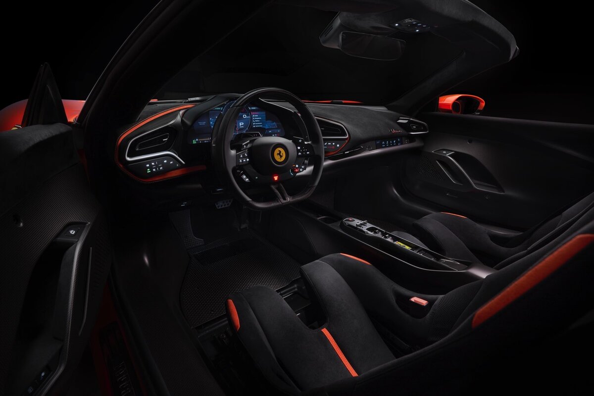 L’abitacolo adotta un’impostazione essenziale, dove tutto è orientato al conducente. Il tunnel centrale ospita il classico cancelletto del cambio in una reinterpretazione moderna, mentre i pannelli porta sono realizzati in un blocco unico di fibra di carbonio, con forme scolpite e integrazione dei componenti funzionali.
