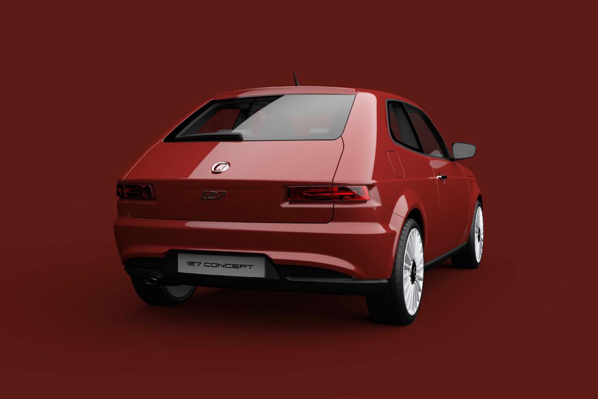 Il posteriore è praticamente identico a quello della vettura originale, reso però qui in maniera squisitamente elegante. Anche il rendering infatti è caratterizzato dal posteriore molto inclinato, dritto e spiovente, che ingloba l’ampio lunotto posteriore e il logo del costruittore e che va poi a creare un grosso spigolo, al di sotto del quale si sviluppa il posteriore dell’auto che quasi “rientra” verso l’interno creando un triangolo. Appena sotto lo spigolo sono posizionati i fari posteriori, semplici e di forma rettangolare, e il logo 127 piuttosto grande. Come l’anteriore, anche qui abbiamo un design estremamente pulito, anche se nettamente più muscoloso: abbiamo una grossa nervatura che segna il confine tra paraurti e portellone del bagagliaio, e che si sviluppa fino a al parafango; e una nervatura più in basso, che fa posto alla targa.