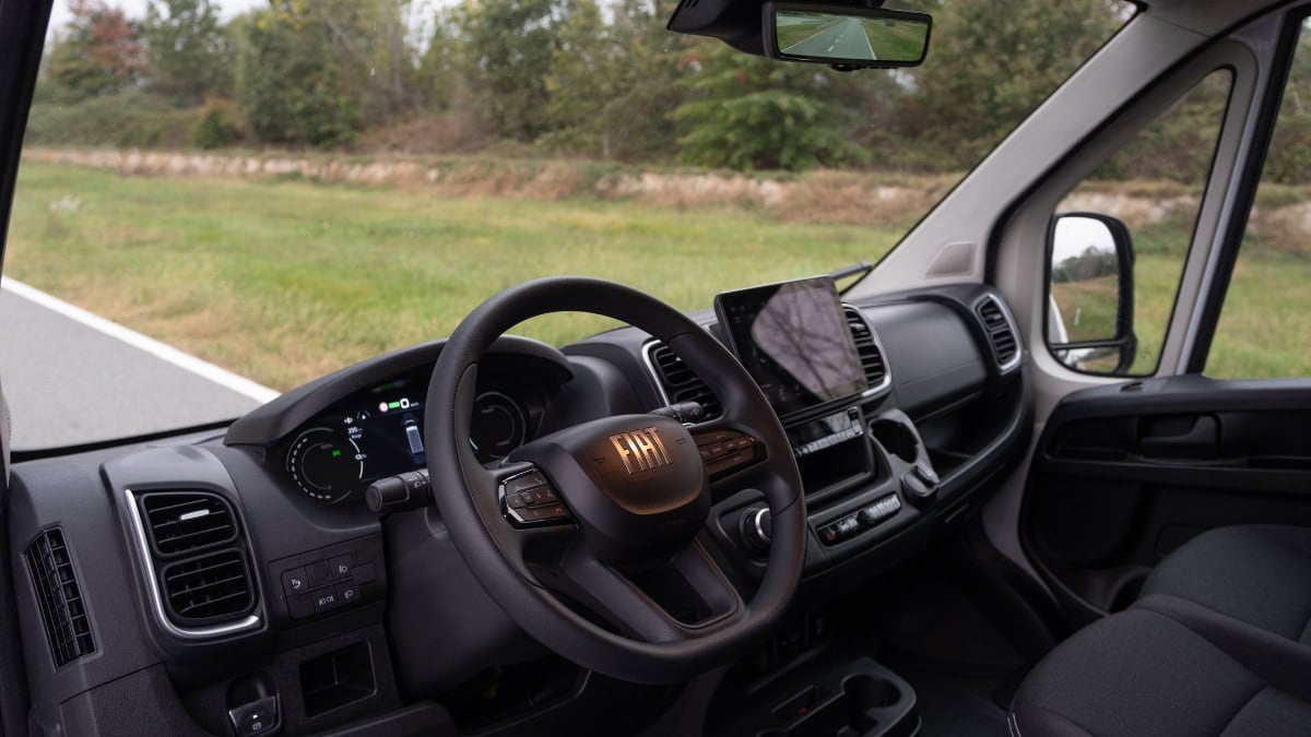 Geniale, però, la soluzione Eat&Work, che si “attiva” abbattendo parte del sedile centrale e disponibile sia su Ducato che su E-Ducato. combina un tavolo antiscivolo per quaderni e laptop, ma anche per vassoi per il pranzo, a porta-bicchieri e spazi per riporre penne e utensili. La panca, inoltre, può ruotare verso gli occupanti per un maggiore comfort. La versione elettrica, quella più completa, ha il Keyless Entry&Go di serie, freno di stazionamento elettrico e i citati display con servizi specifici F2M eSolution, sempre di serie.