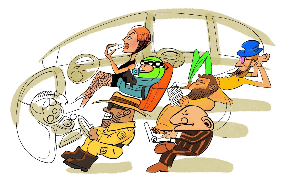 Tutti fumetti che finirono sulle t-shirt e sui puzzle accessori alla vettura, e che oggi ne sono parte integrante. Al centro della prima fila, il bimbo che sogna di essere un pilota con il casco da gara, mentre di fianco a lui la signora che si trucca. Dietro, il manager con il suo abito elegante e il laptop, il frate che legge e il giovane hippie sdraiato sul sedile reclinato.