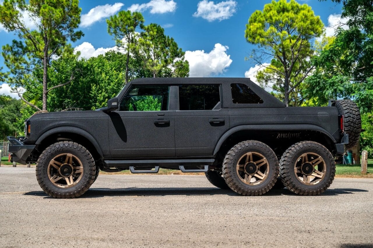 Questo esemplare di Ford Bronco è stato modificato da Apocalypse Manufacturing, facendolo diventare un pick-ip a 6 ruote motrici, un po’ come visto con il Mercedes G63 6×6, ma anche con Rolls-Royce Phantom, Toyota Tundra e Range Rover, tanto per citare qualche esempio.