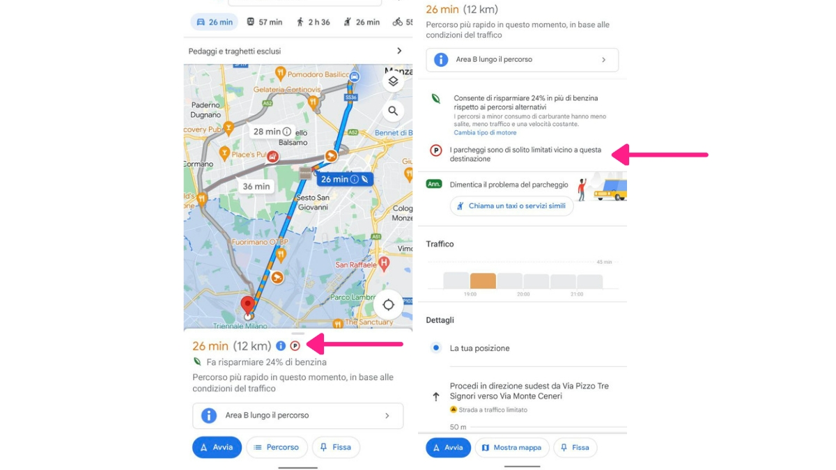 Google Maps, come fornisce informazioni sull’affollamento di un dato locale in un certo orario, così, una volta impostato un percorso, fa comparire il simbolo “P” nella zona inferiore dello schermo, espandendo la quale fa comparire un’interfaccia dedicata al parcheggio. Se non la vedi, è perché nella tua zona Google non l’ha ancora implementata.