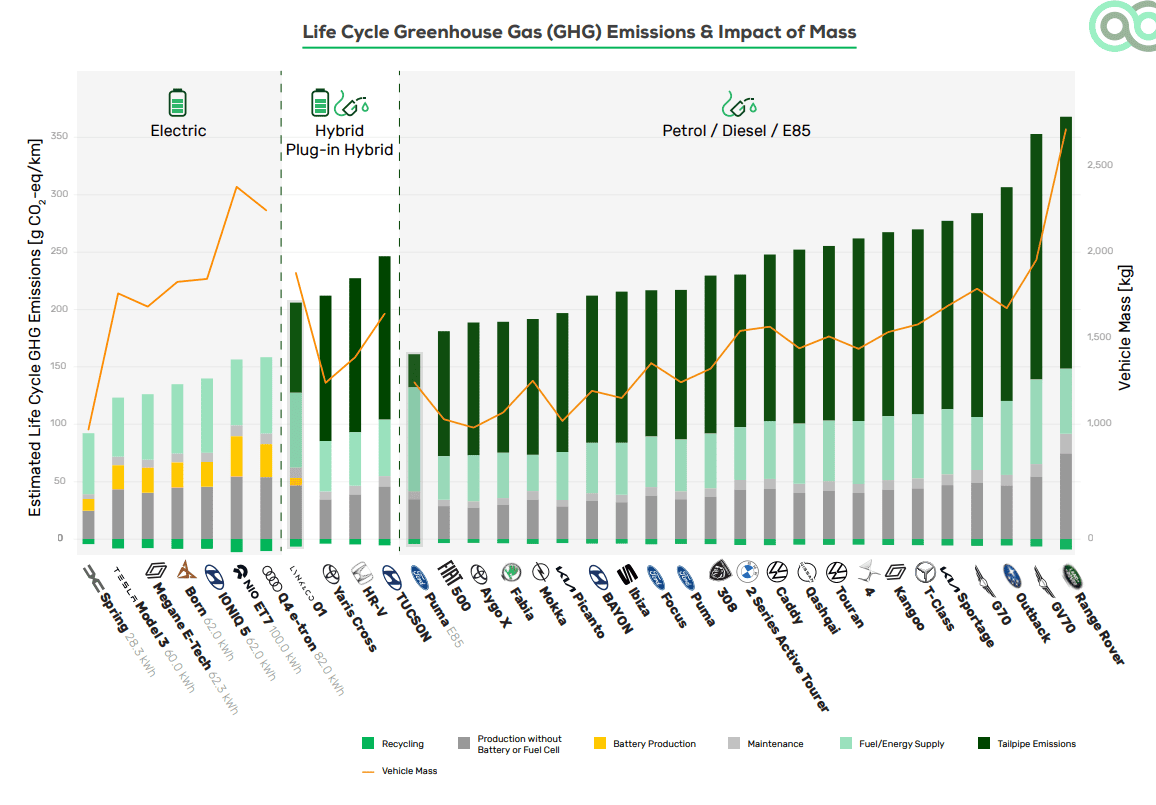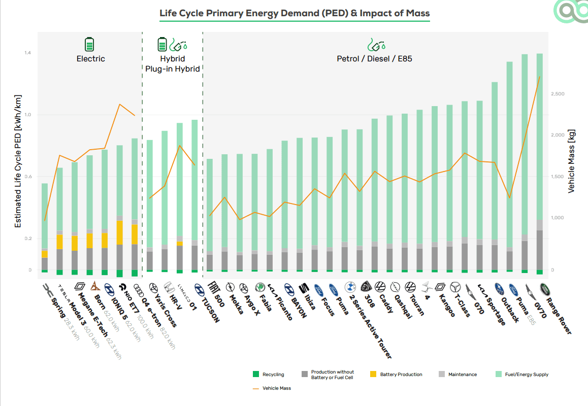 Come detto inizialmente, i risultati LCA mostrano che i veicoli elettrici sono in prima linea nella riduzione dei gas serra, e anche questo lo avevamo già pubblicato noi qualche mese fa: Green NCAP dimostra come i veicoli a batteria producono fino al 50% in meno di emissioni rispetto alle auto a benzina convenzionali in base al modello scelto. Le differenze però si assottigliano quando si parla di domanda energetica, e questo perché le auto elettriche sono quasi tutte dei SUV. Infatti, gli Sport Utility Vehicle ibridi ed elettrici testati dimostrano un consumo di carbururante più elevate, con aumento delle emissioni e quindi valori del ciclo di vita compresi tra i 200 e i 240 g di CO2 al km e 0,85-1,0 kWh di energia elettrica a km.