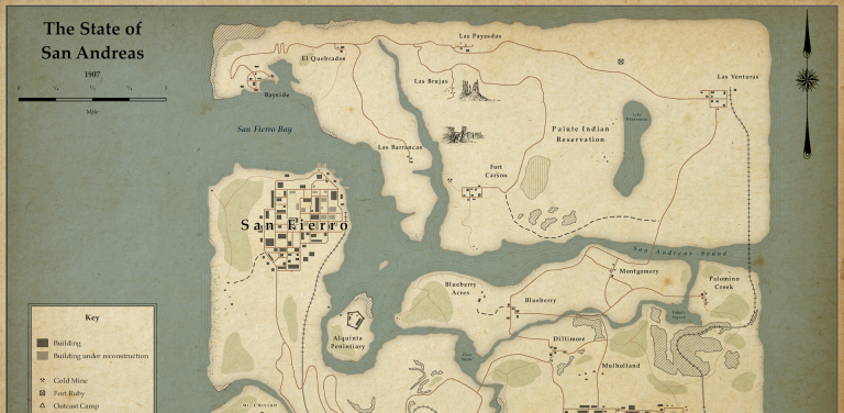 L’idea è venuta a un certo ProfessorIshirkov, un grande fan della saga prodotta da RockStar Games, che ha provato a immaginare a un GTA San Andreas ambientato nel 1907. Il gamer ha pensato a lungo su una mappa di gioco, e l’ha postata su Reddit con tutte le sue motivazioni. Prima di tutto, non esisteva ancora Las Venturas (la città che si ispira a Las Vegas, nel gioco). Una metropoli, com’è noto, piena di luci, che però nel primo decennio del XX secolo era solamente una terra desolata, e solo pochi decenni dopo la mafia avrebbe iniziato a costruire club e casinò, rendendola la metropoli mondana che conosciamo oggi.