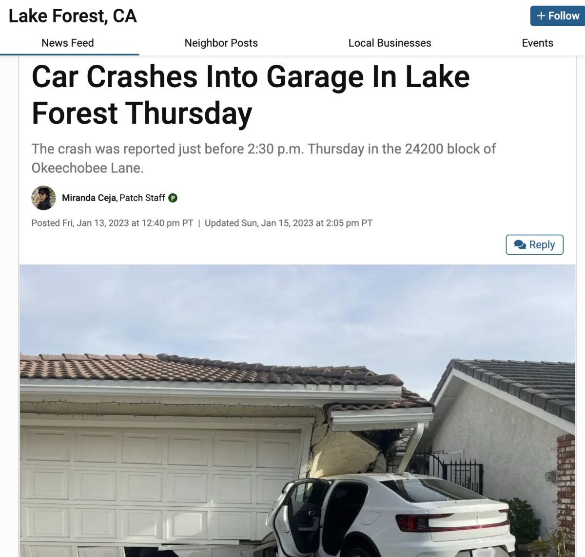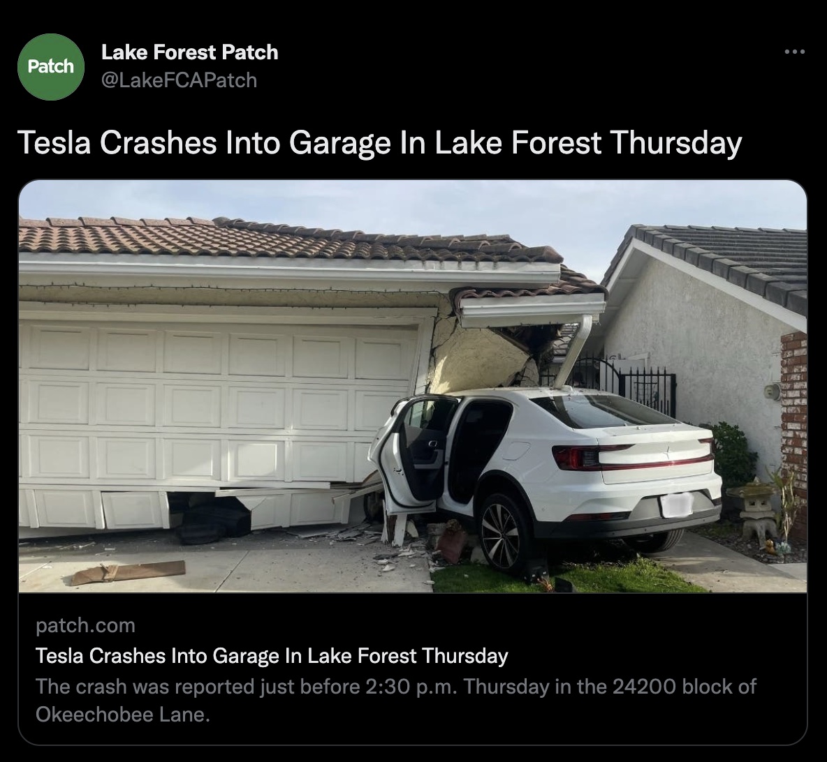 Lo scorso venerdì, un articolo del Lake Forest Patch riportava che una Tesla si fosse schiantata contro una casa lo scorso 12 gennaio 2023, alimentando anche l’interesse viste le frequenti notizie relative agli incidenti delle elettriche californiane, spesso causati dalla guida autonoma.