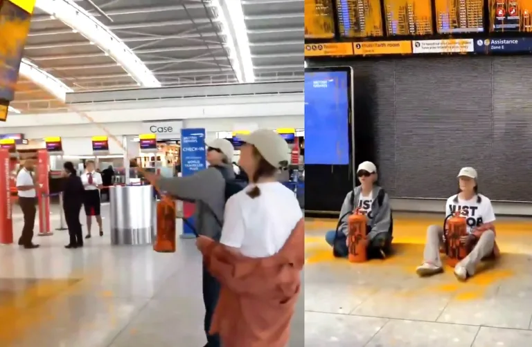 Il gruppo ha rilasciato una dichiarazione di Phoebe Plummer, 22 anni, una delle due persone arrestate a Heathrow. Plummer ha affermato: “Le persone in tutto il mondo si stanno sollevando per chiedere la fine del petrolio entro il 2030. Questo è un problema internazionale, quindi le persone comuni stanno facendo ciò che i nostri politici non faranno, lavorando insieme a livello globale per fermare i danni e le sofferenze causate dai combustibili fossili.”