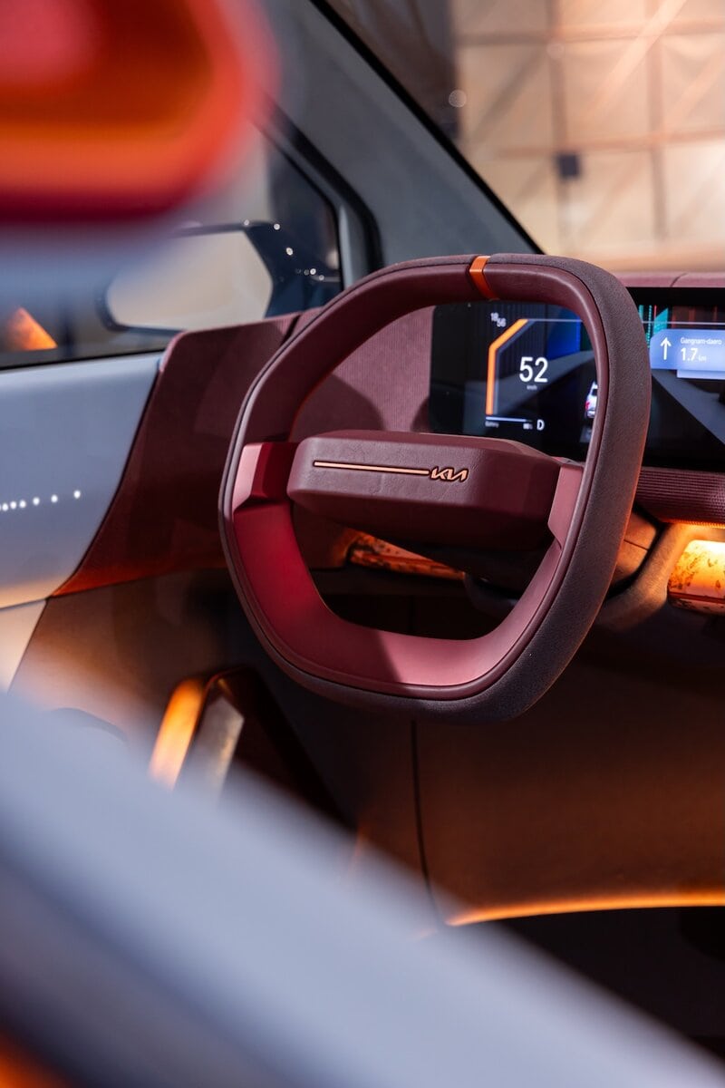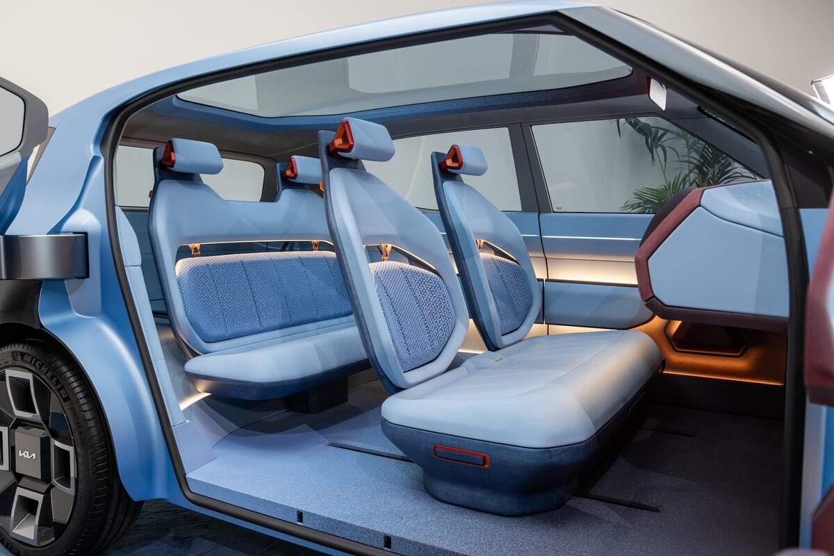 Accanto a questo, il micelio – coltivato in collaborazione con Biomyc – ha rivestito superfici e inserti, grazie alle sue proprietà isolanti e alla possibilità di essere personalizzato in tinta e texture. Kia ha utilizzato due tipologie di micelio, combinando funzionalità ed estetica, con oltre 180 campioni testati per trovare la combinazione ideale.