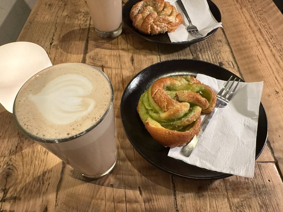 Niente colazione in hotel, ma nella mia caffetteria preferita di Aalborg, con Chai Latte e dolcetto