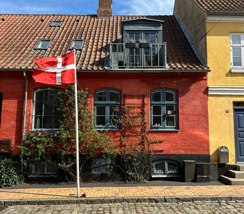 …Con le tipiche case a graticcio danesi, dai colori vivaci che spiccano con questo sole (e caldo)