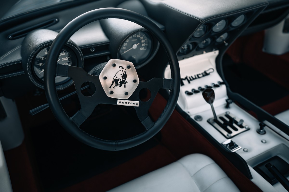 Le prese d’aria nere e la livrea Nero Aldebaran sul cofano emulano le ampie prese d’aria verniciate di nero della Miura. I terminali di scarico sono in nero opaco, mentre i cerchi della Ultimae in argento lucido con pinze freno nere richiamano i cerchi originari argentati montati sulla Miura.