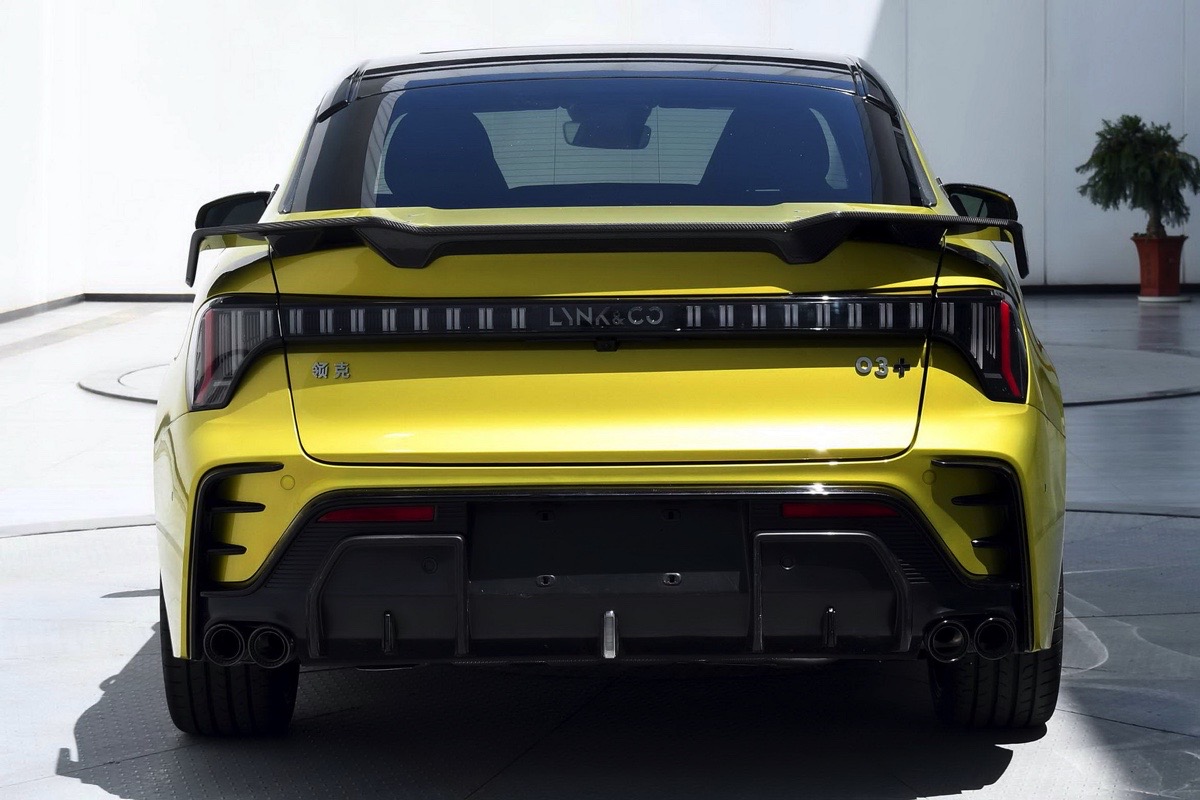 Sul retro della Lynk & Co 03 Facelift, la targa è stata spostata sul paraurti posteriore, che ha ricevuto anche doppi terminali di scarico ovali e prese d’aria più grandi sui lati. I fanali posteriori erano già collegati da una striscia nera, ma il numero di LED è aumentato, lasciando meno spazio alla scritta Lynk & Co.