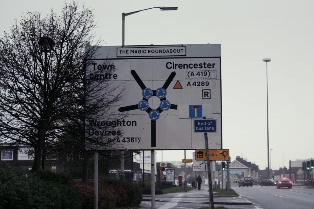 Qui sopra il video aereo della Magic Roundabout la rotatoria all’interno della quale dove sono presenti cinque mini-rotatorie, che venne inaugurata a Swindon nel 1972,. Una delle caratteristiche è che il flusso di traffico attorno alla circonferenza interna è antiorario, mentre il traffico scorre nel consueto senso orario attorno alle cinque mini-rotatorie dell’anello esterno.