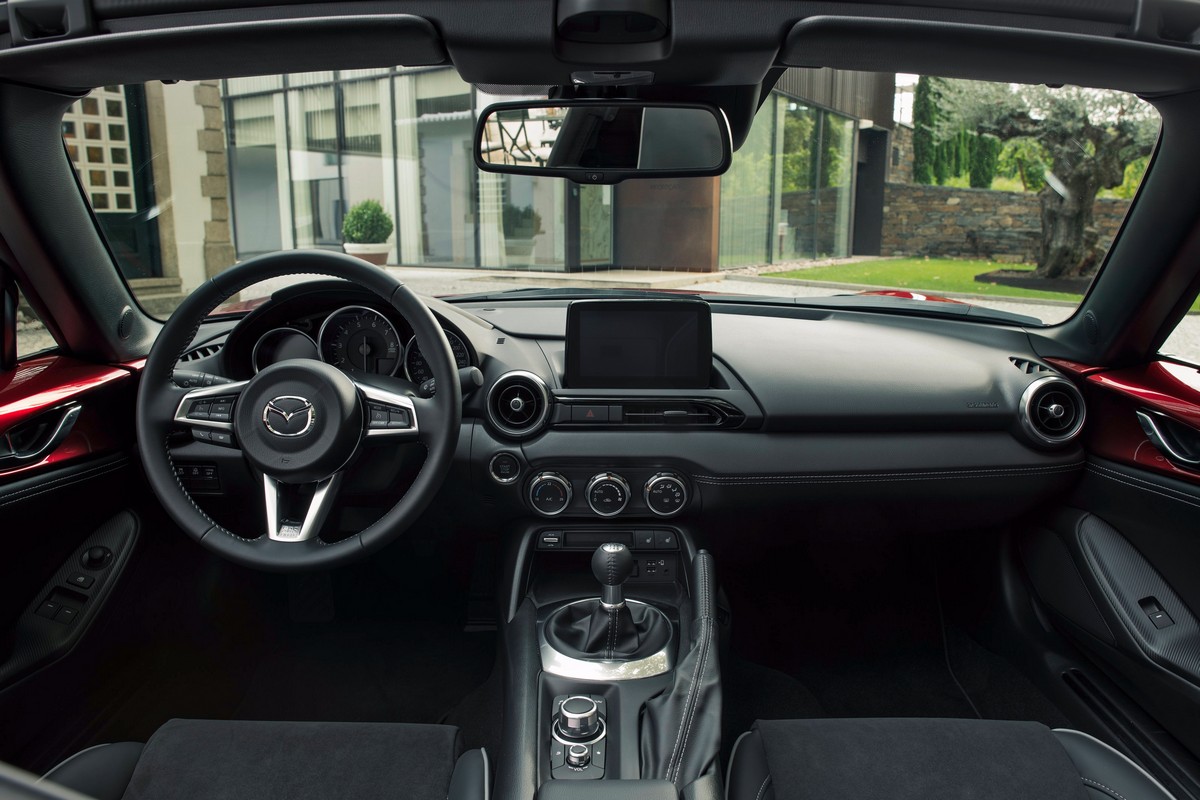 All’interno, il conducente e il passeggero sono seduti più in basso rispetto alle MX-5 delle precedenti generazioni e godono di una migliore visibilità a 360 gradi, nonché di una più semplice regolazione del sedile e azionamento delle porte. Il piantone dello sterzo è regolabile non solo in altezza ma anche in profondità, con volante, strumenti e comandi tutti disposti simmetricamente lungo un unico asse per azionarli senza stress e fatica.
