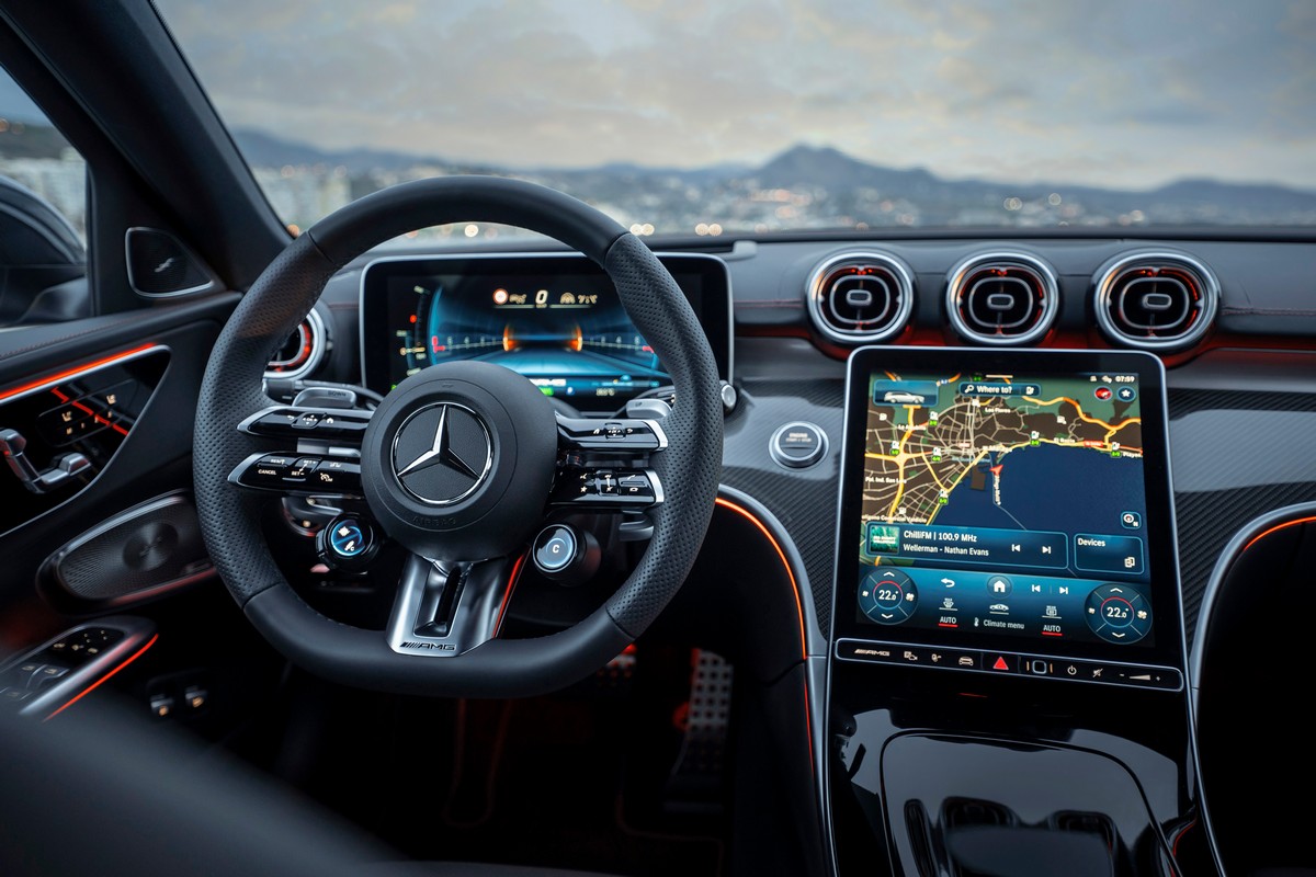 Il sistema di infotainment MBUX comprende diversi display e funzioni specifiche per AMG e per l’ibrido che includono i display nel quadro strumenti, sul display centrale multimediale in orientamento verticale nella console centrale e l’head-up display opzionale.