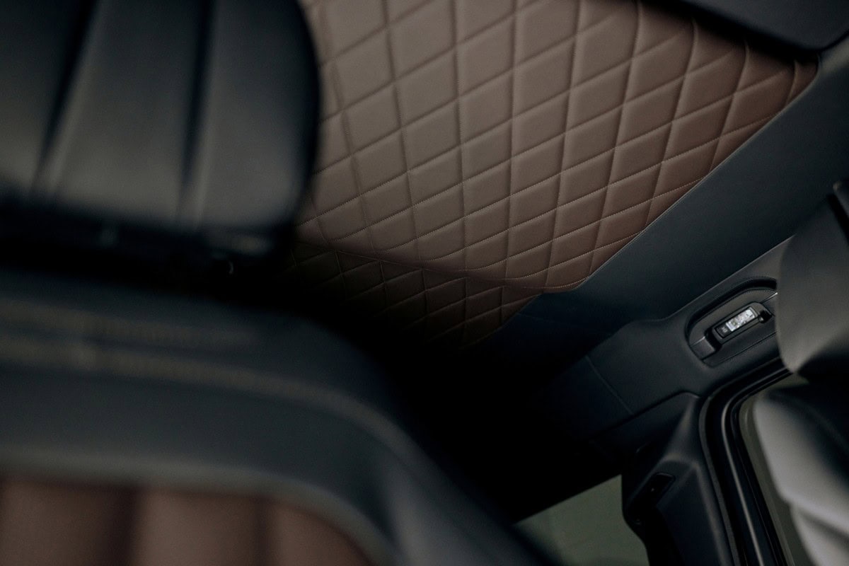 La sezione centrale dell’headliner è in tinta con il pannello centrale dei sedili e presenta lo stesso disegno a diamante. In combinazione con la verniciatura metallizzata nero ossidiana, è disponibile in grigio titanio perlato/nero. Nella variante laccata magno bianco opalitico, la sezione centrale è colorata in bianco platino/nero, e nella versione laccata magno oliva in marrone espresso/nero.